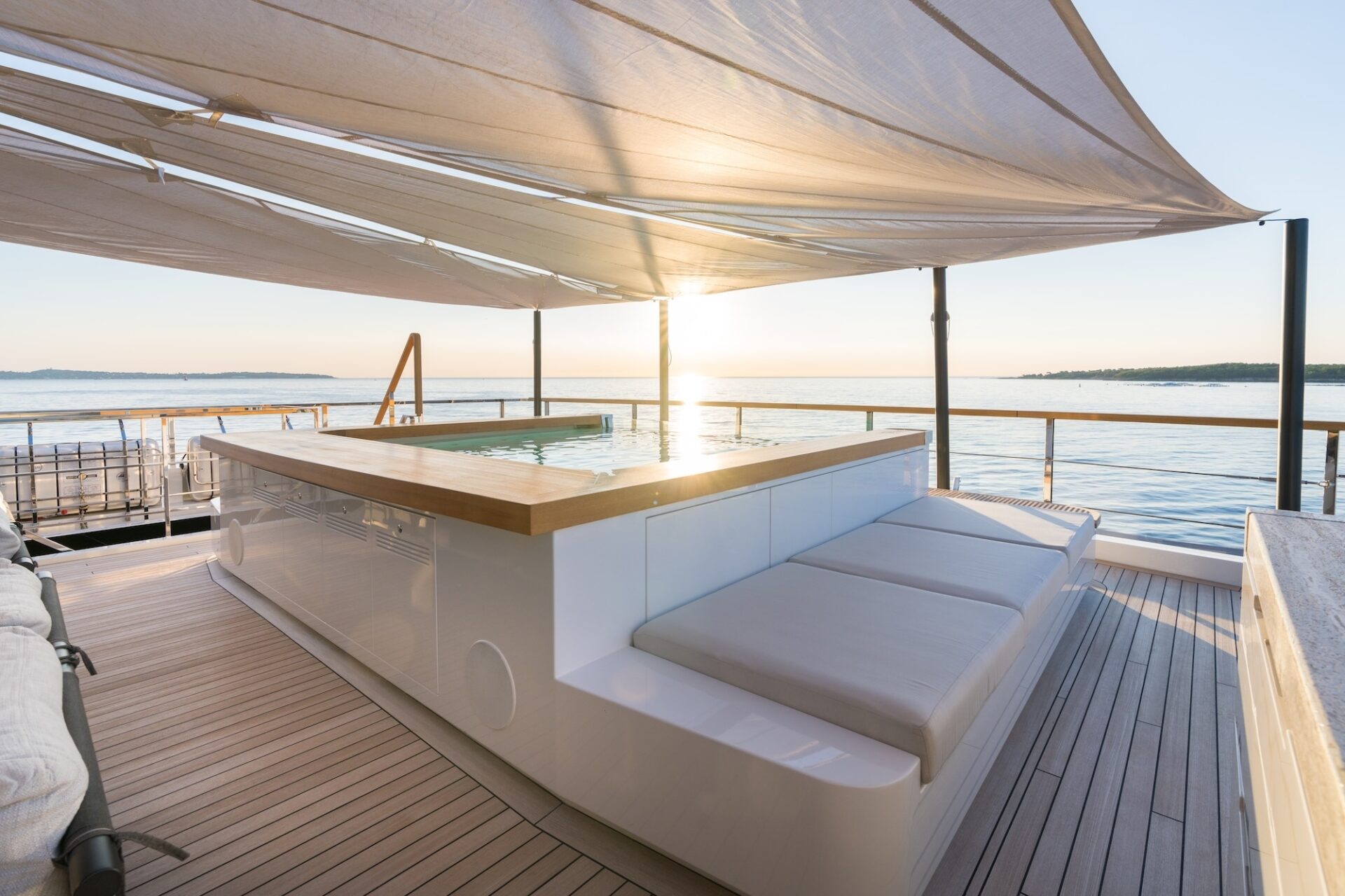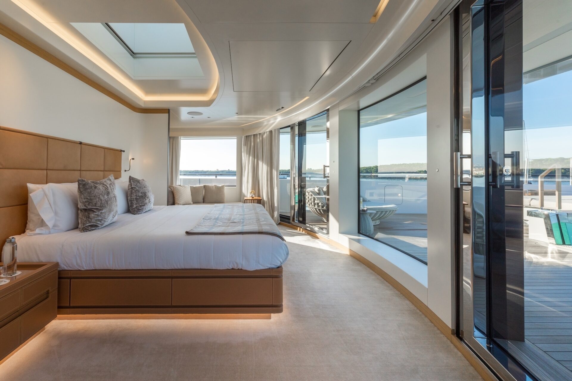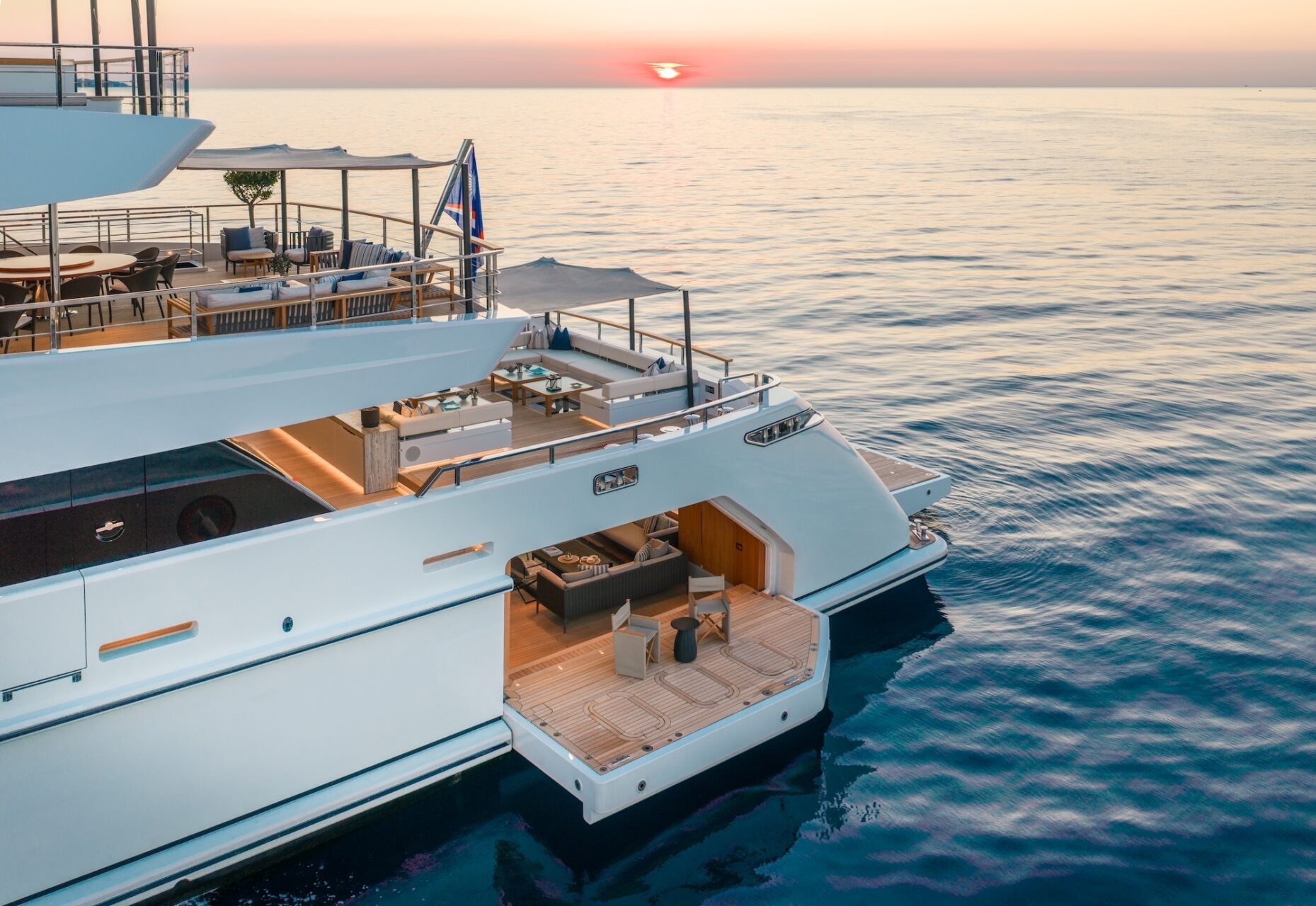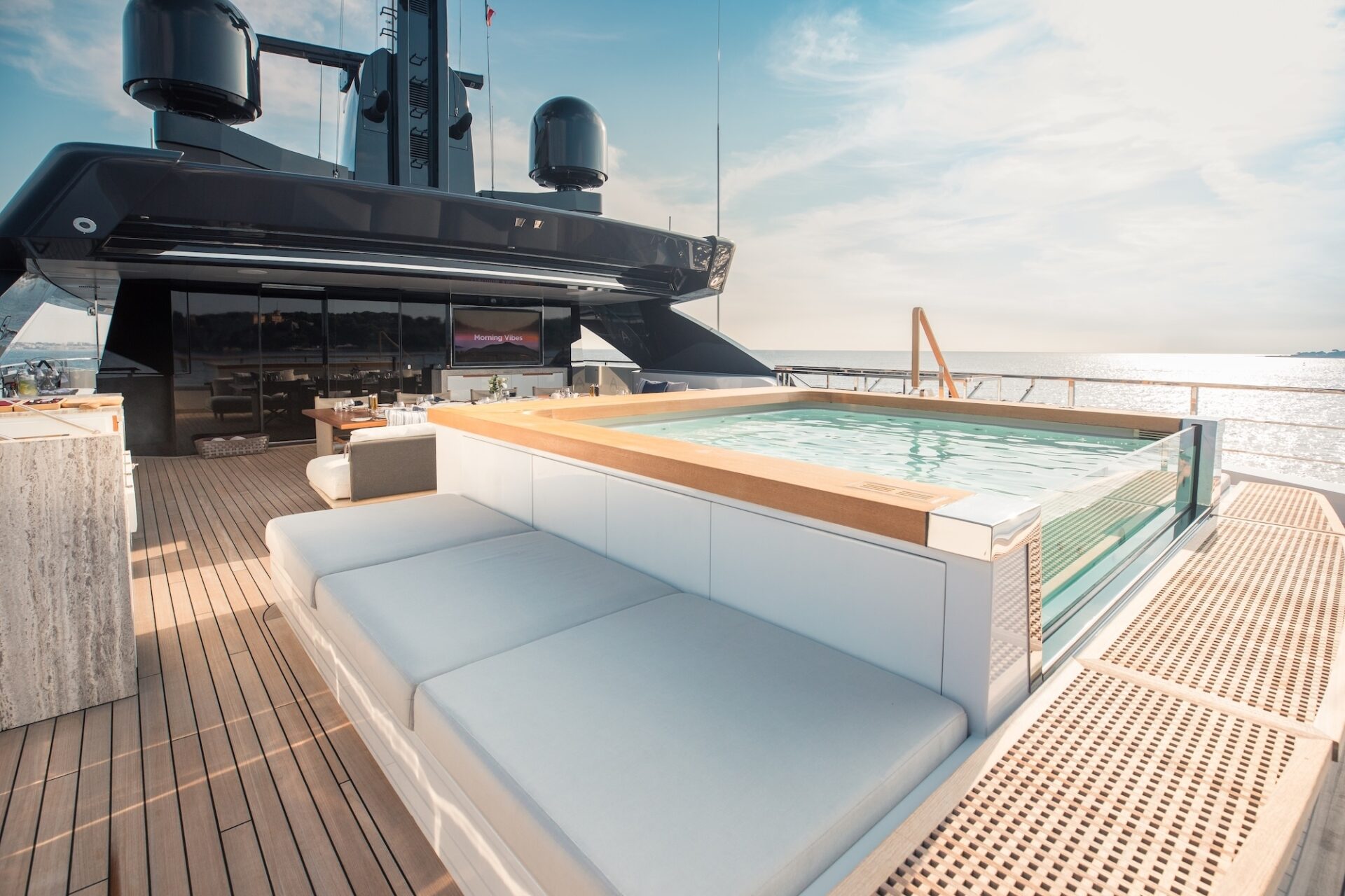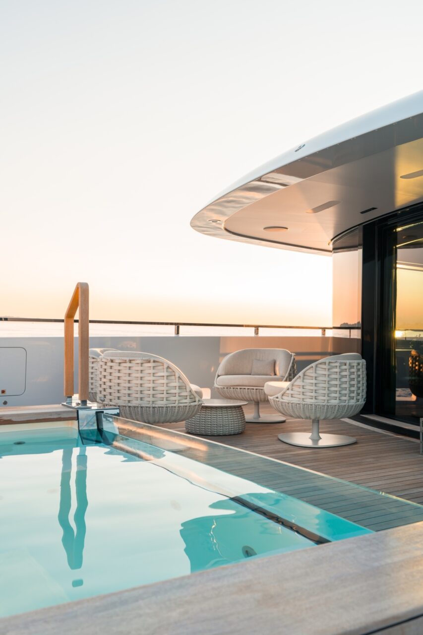 Outdoor living is a defining feature. An expansive beach club features fold-down platforms, which create a vast waterside lounge with direct spa and gym access, while the foredeck incorporates a secluded relaxation area. The bridge deck offers a substantial jacuzzi, al fresco dining and generous open-air lounging, with flexible configuration options.