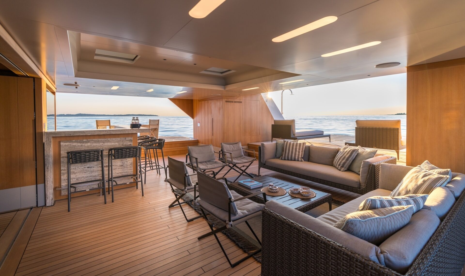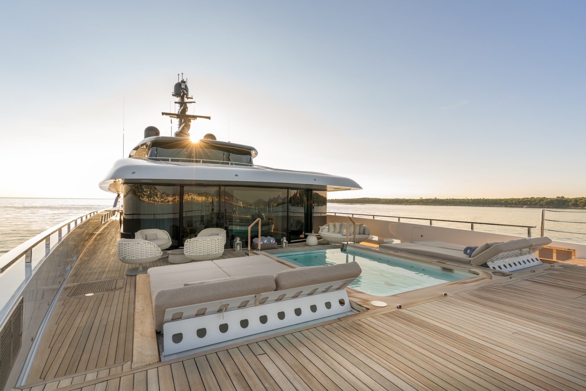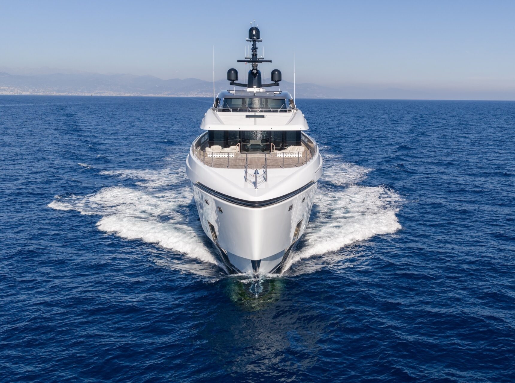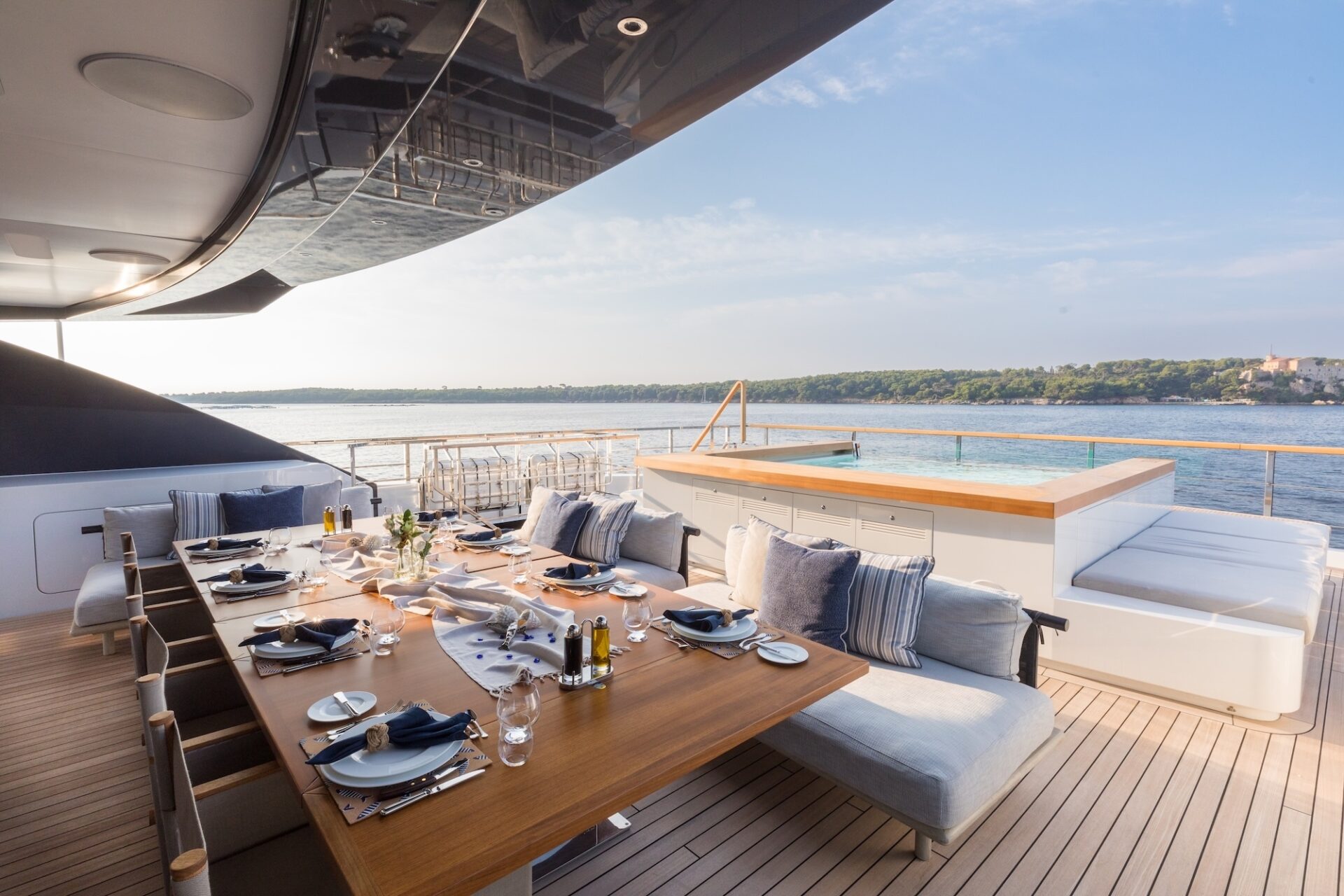 Outdoor living is a defining feature. An expansive beach club features fold-down platforms, which create a vast waterside lounge with direct spa and gym access, while the foredeck incorporates a secluded relaxation area. The bridge deck offers a substantial jacuzzi, al fresco dining and generous open-air lounging, with flexible configuration options.