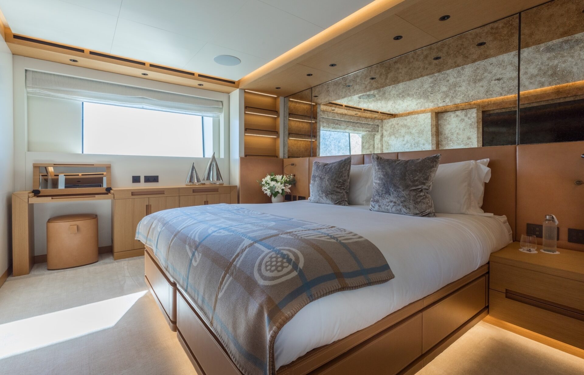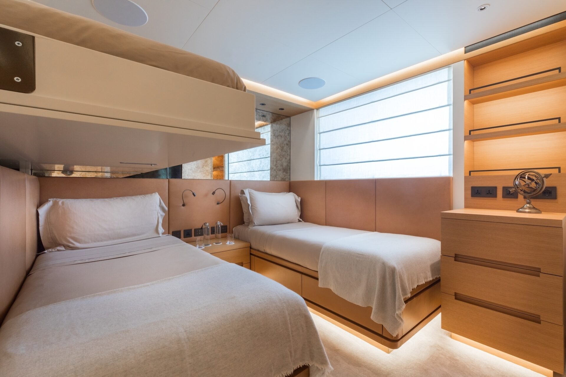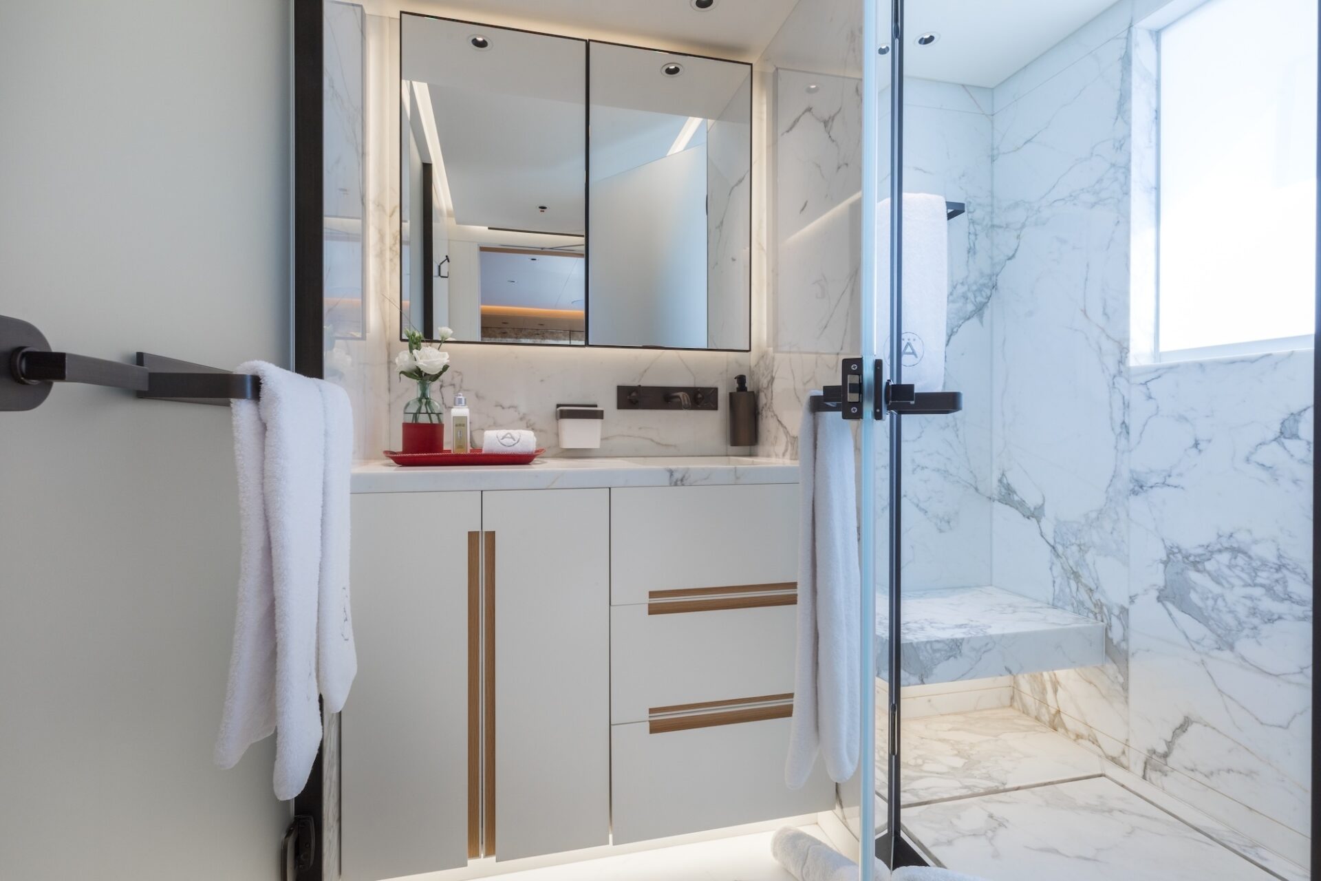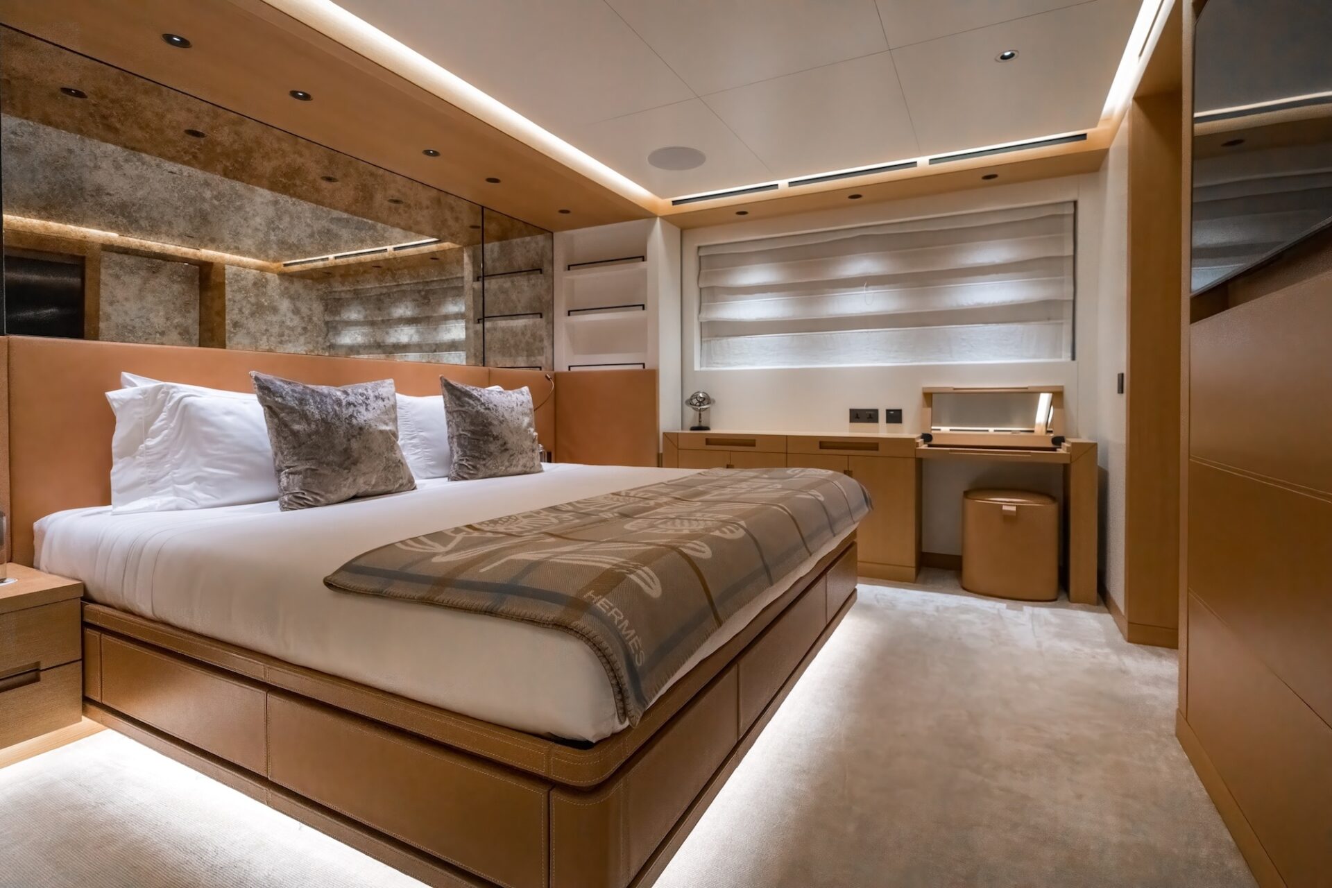 Accommodation is for 12 guests in 6 suites, including a full owners deck, with dedicated study and private exterior access. The main deck has two VIP suites and three further guest cabins, providing excellent flexibility for family, whilst the lower deck hosts a professional wellness centre with gym and hammam. Crew quarters accommodate a team of up to 16, ensuring seamless and discreet service delivery.