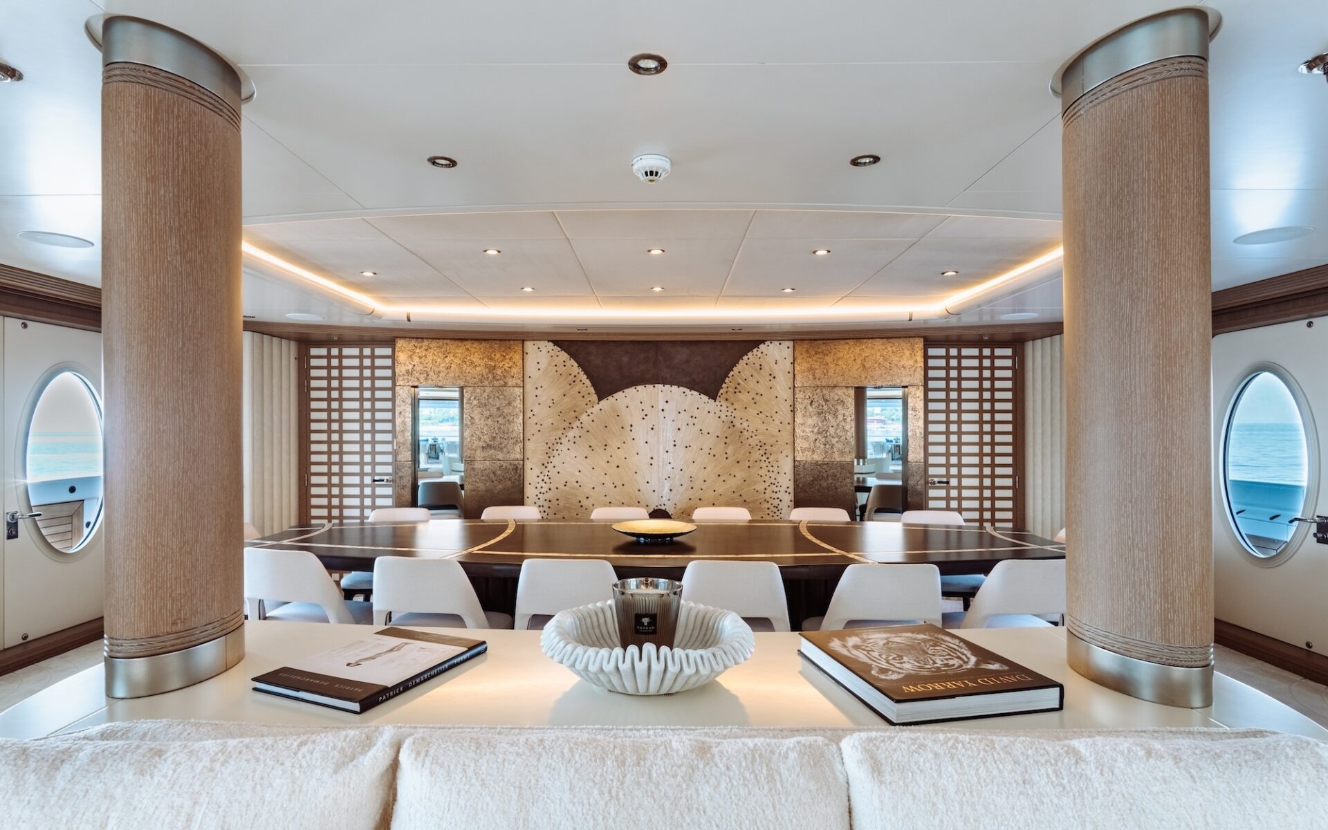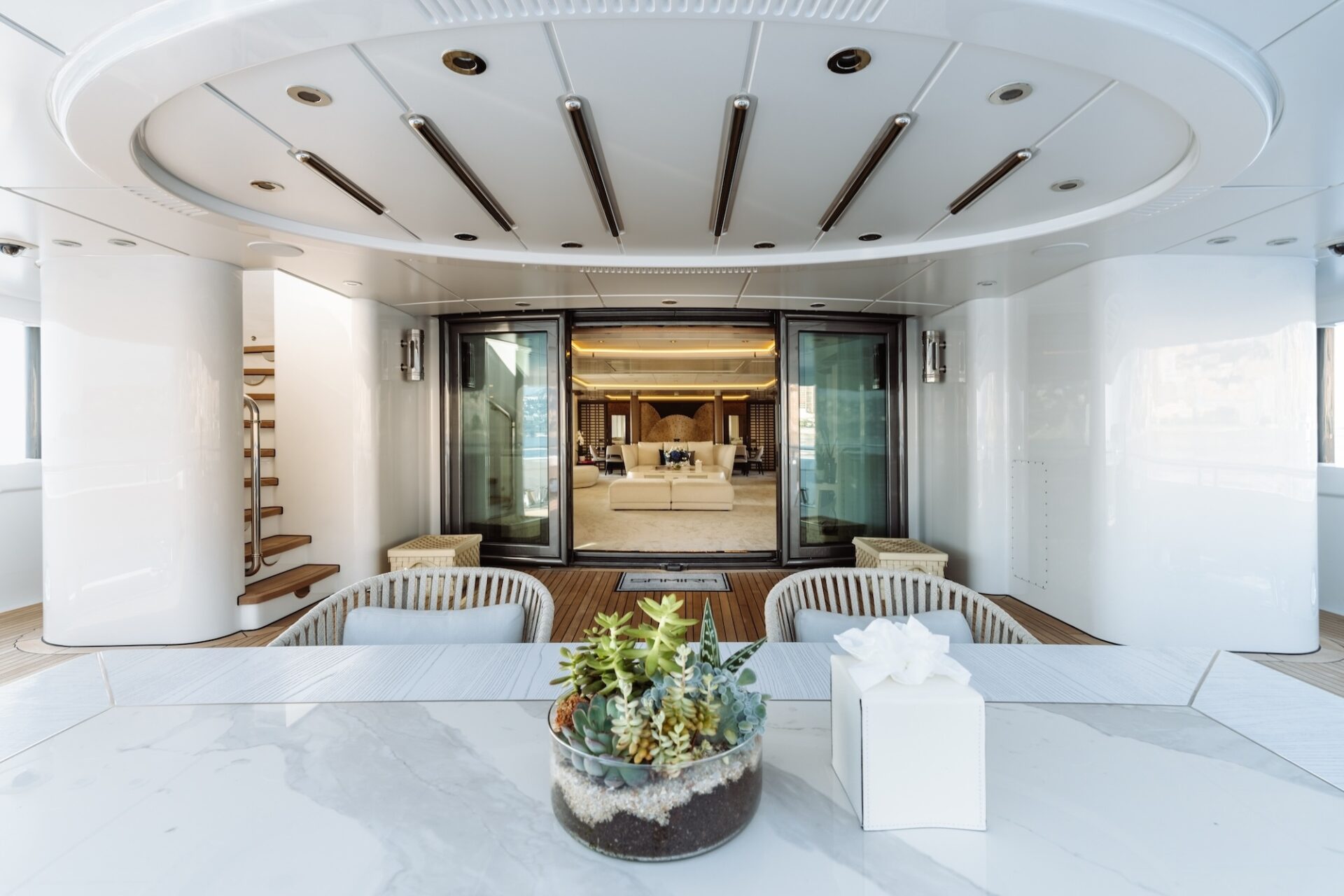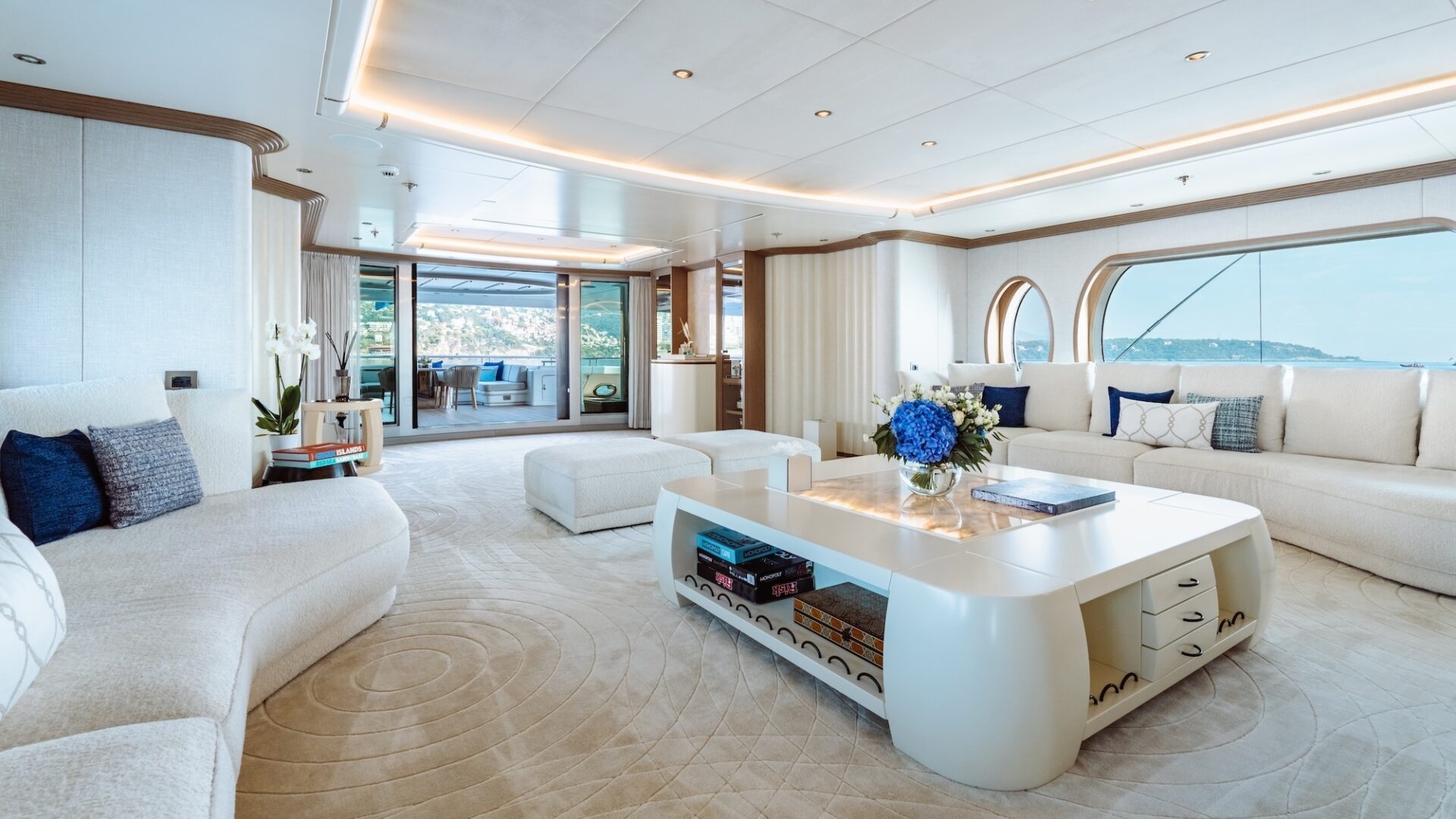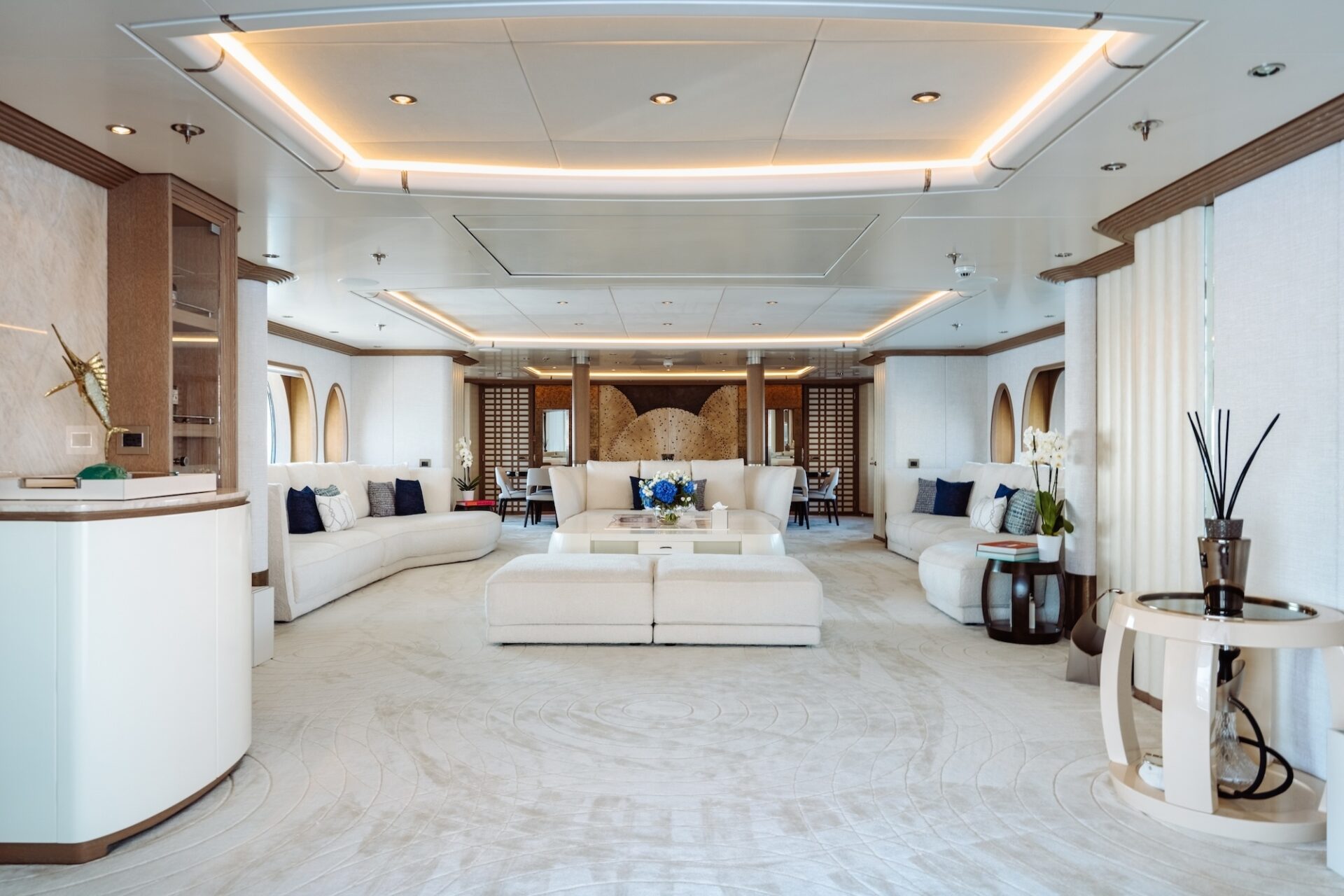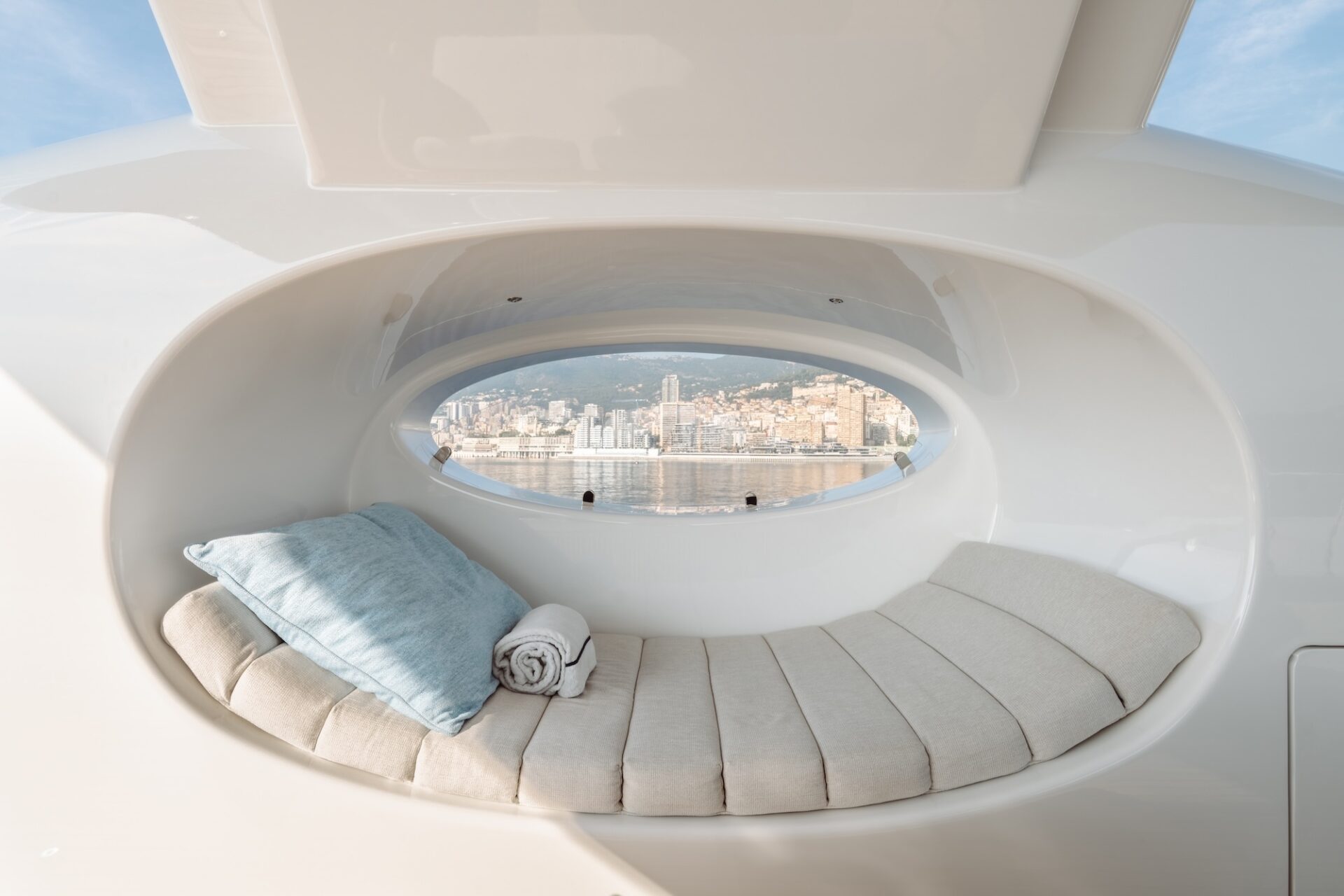 Bright, open interiors feature large expansive windows, a welcoming saloon and formal dining area for 14-16 guests, with fold-down balcony on the port side connecting seamlessly to the sea. She boasts a large swim platform, accompanying lazarette and beautiful sky lounge, which offers a relaxed retreat with games tables and ample seating, leading to an expansive aft deck for al fresco dining. Above, a vast sun deck, that surpasses any 55m in the global fleet, offers space for entertaining and panoramic views.