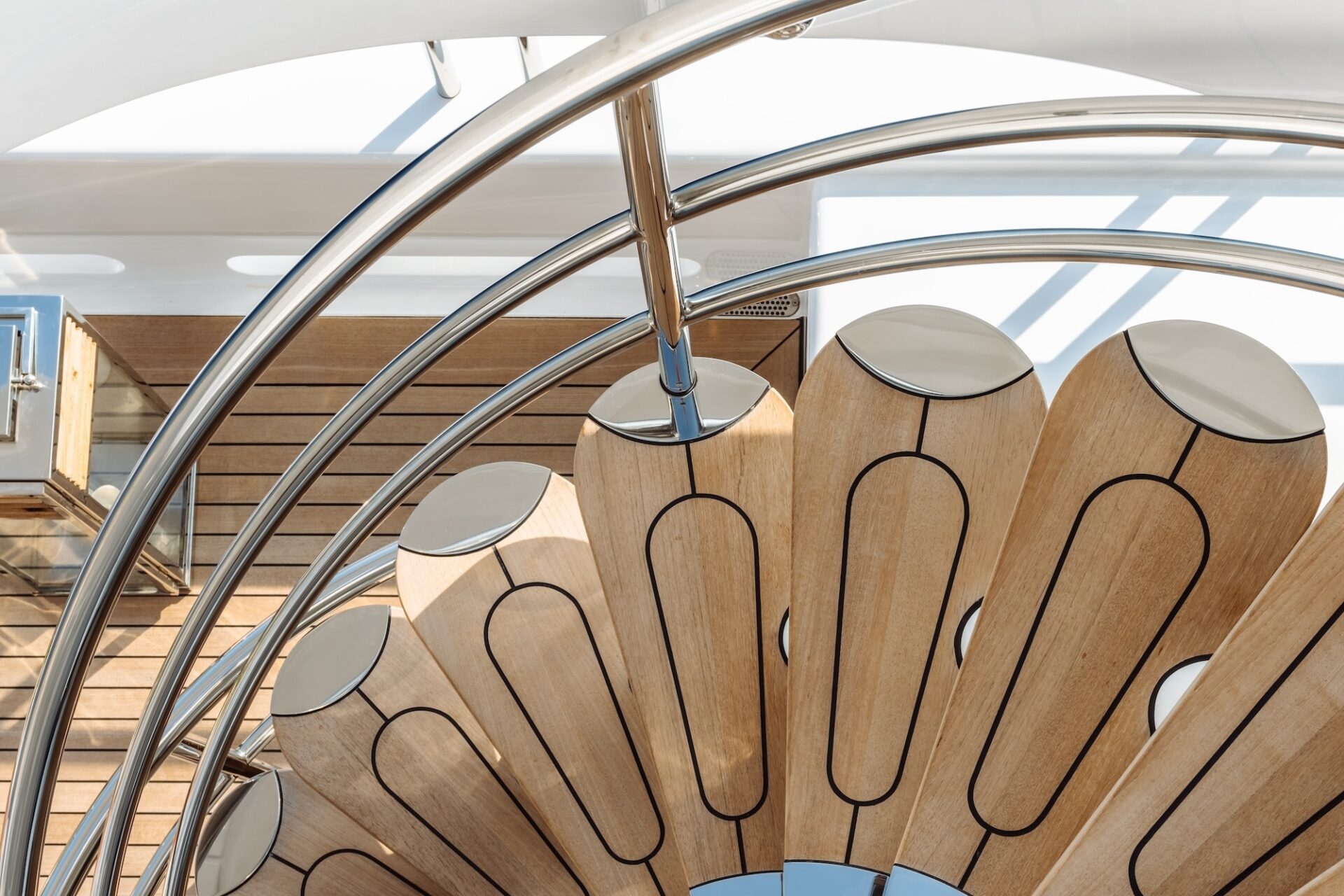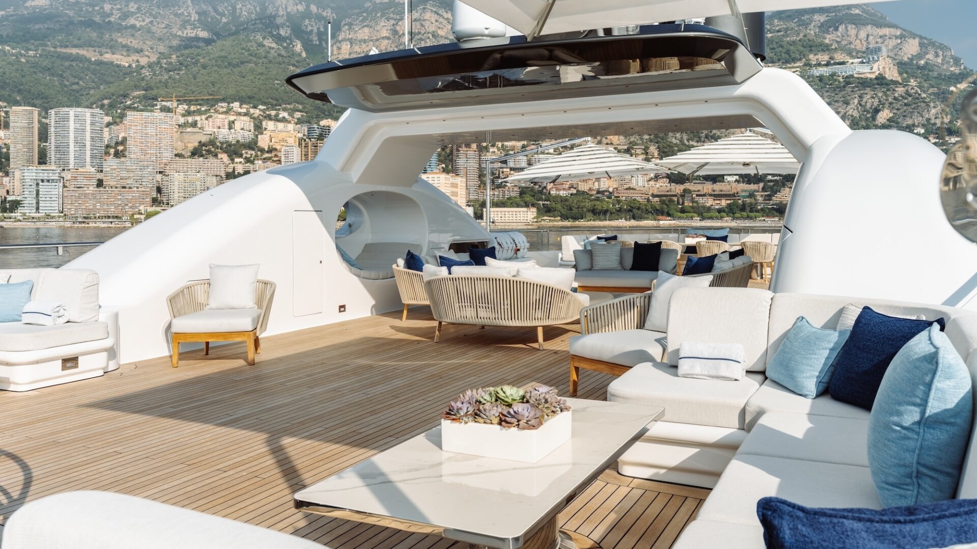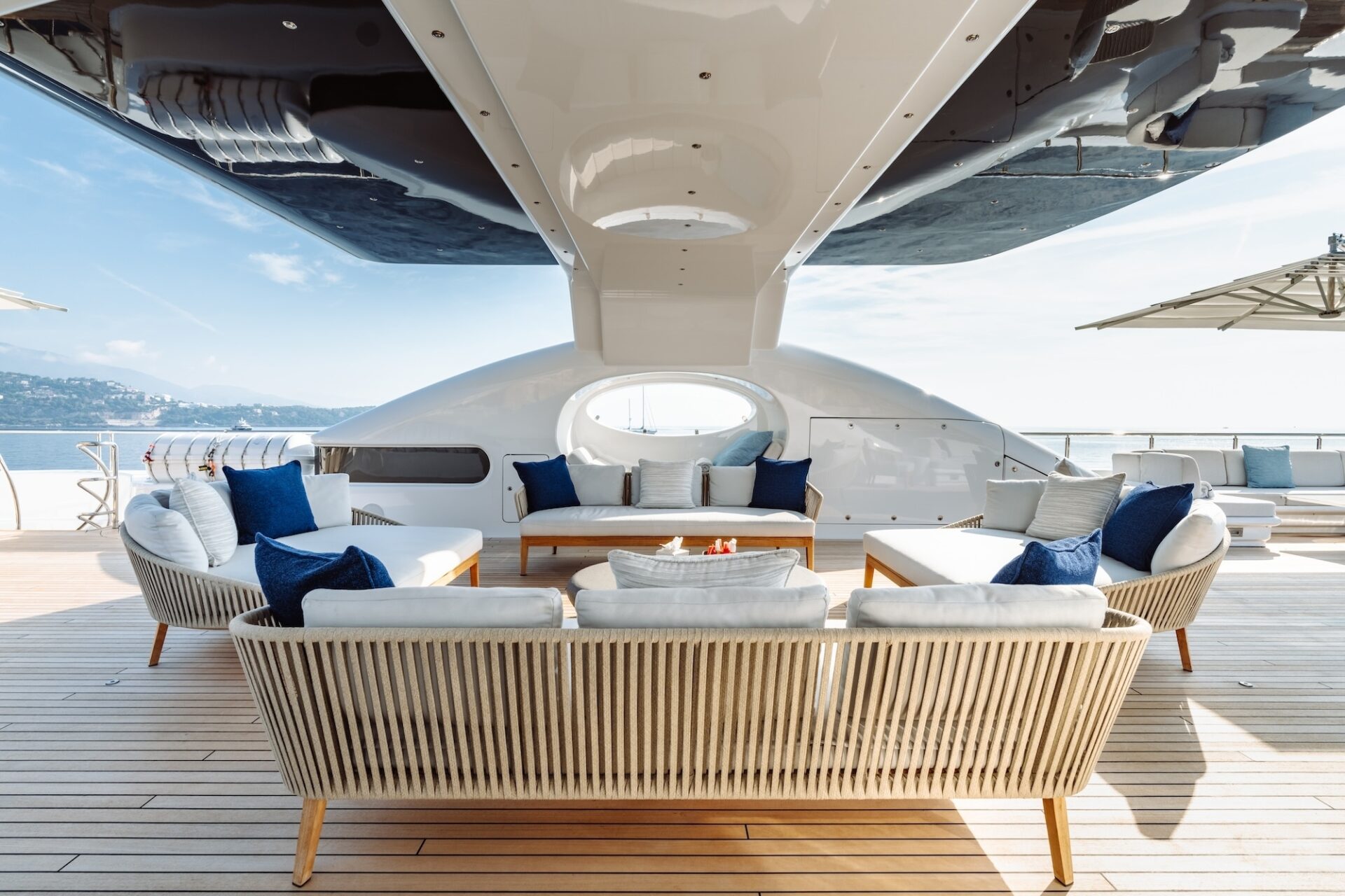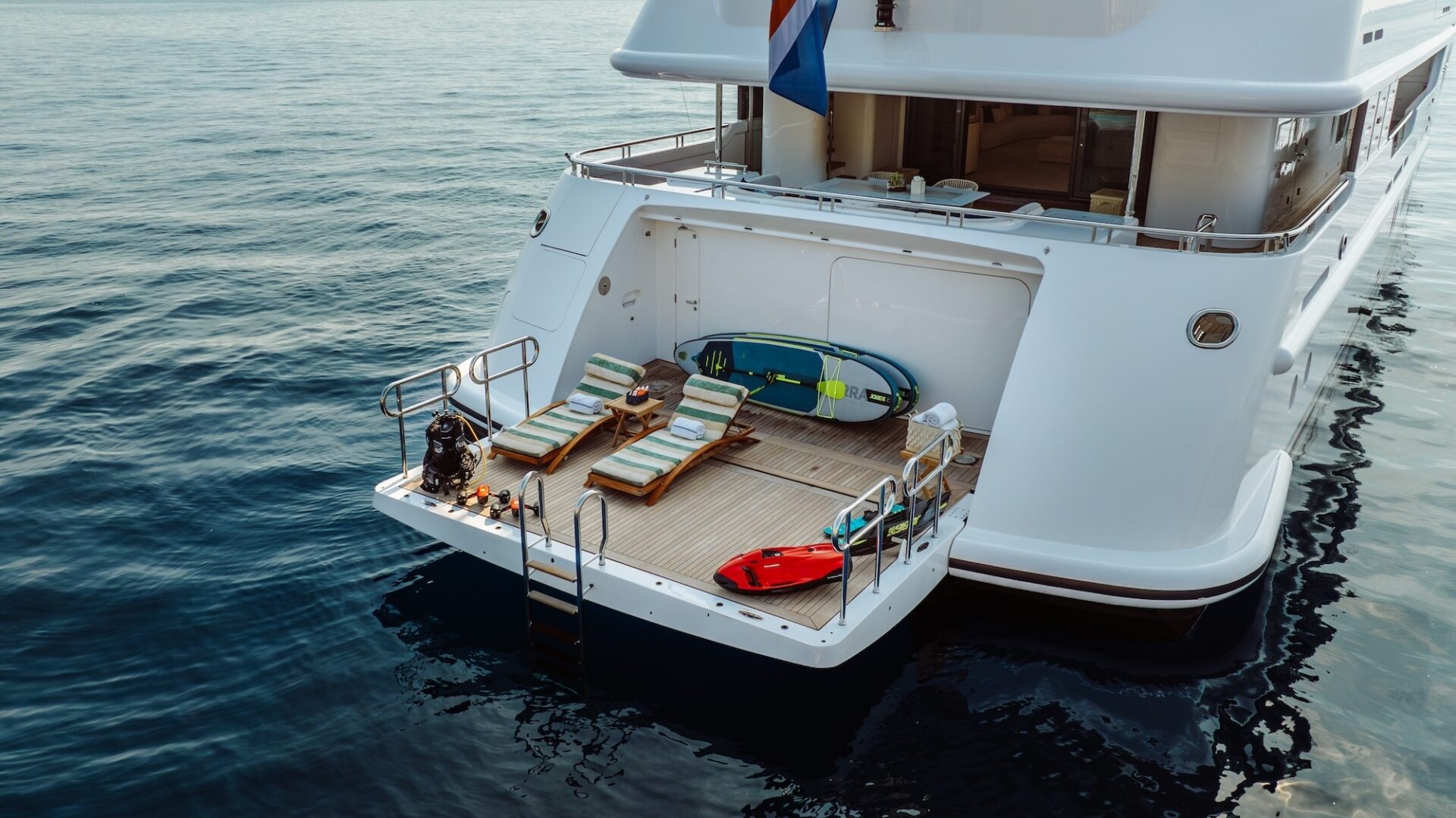 Bright, open interiors feature large expansive windows, a welcoming saloon and formal dining area for 14-16 guests, with fold-down balcony on the port side connecting seamlessly to the sea. She boasts a large swim platform, accompanying lazarette and beautiful sky lounge, which offers a relaxed retreat with games tables and ample seating, leading to an expansive aft deck for al fresco dining. Above, a vast sun deck, that surpasses any 55m in the global fleet, offers space for entertaining and panoramic views.