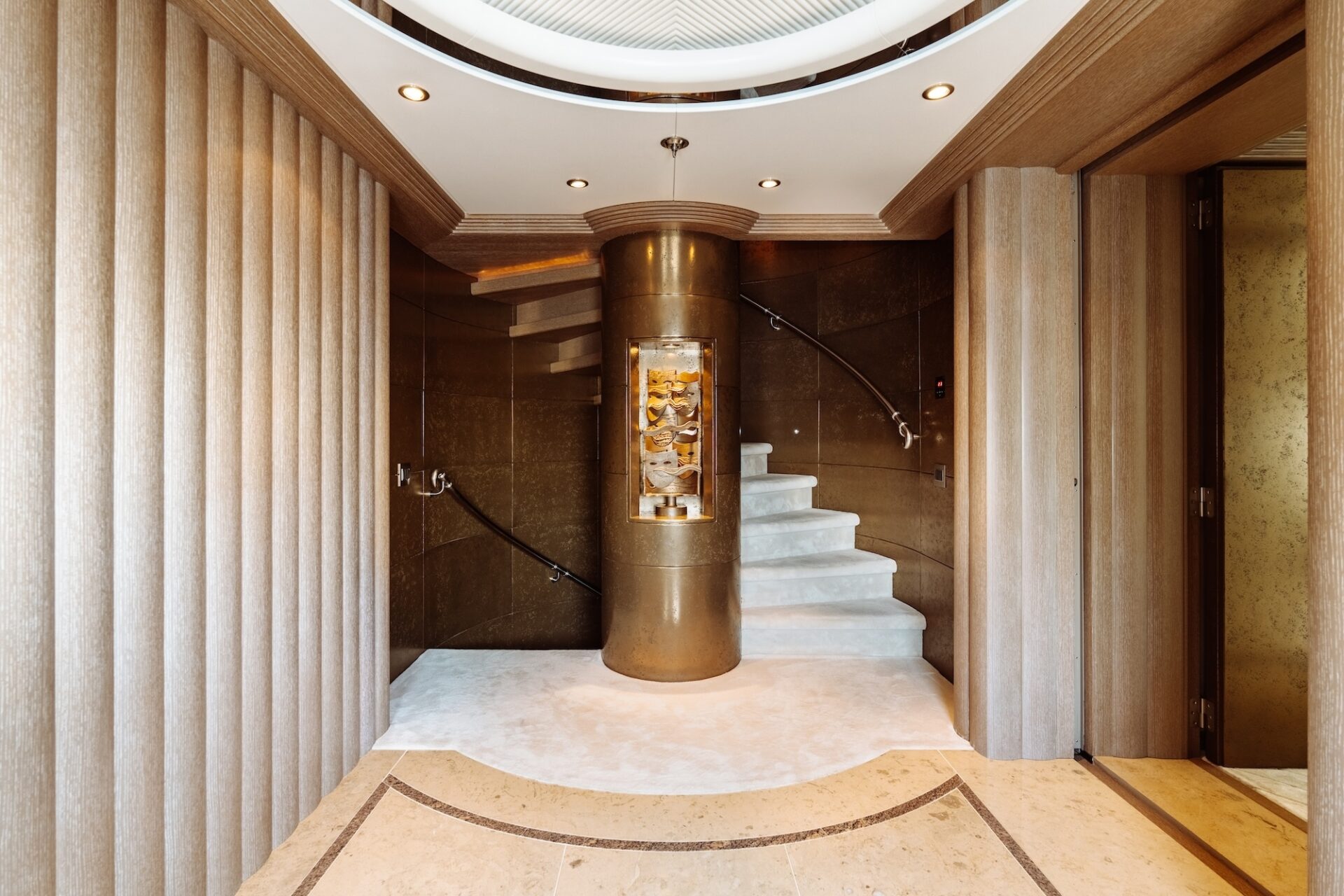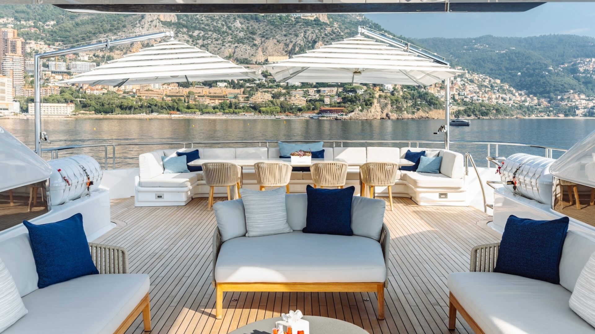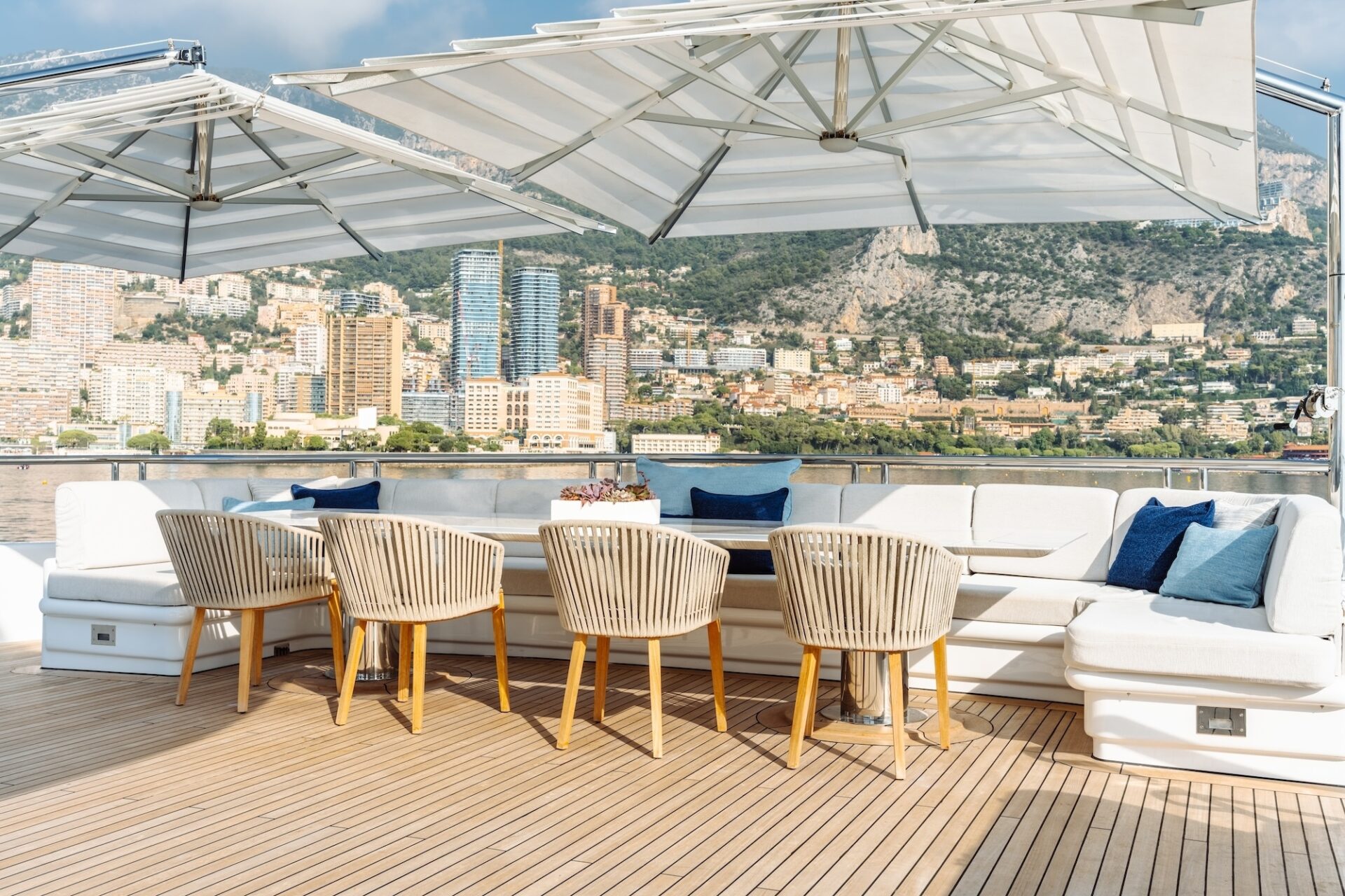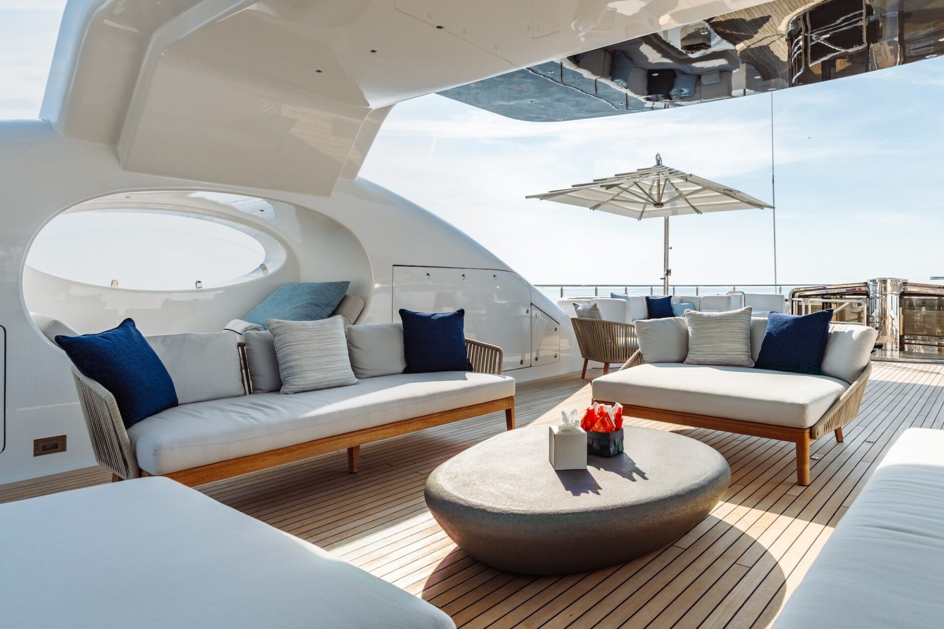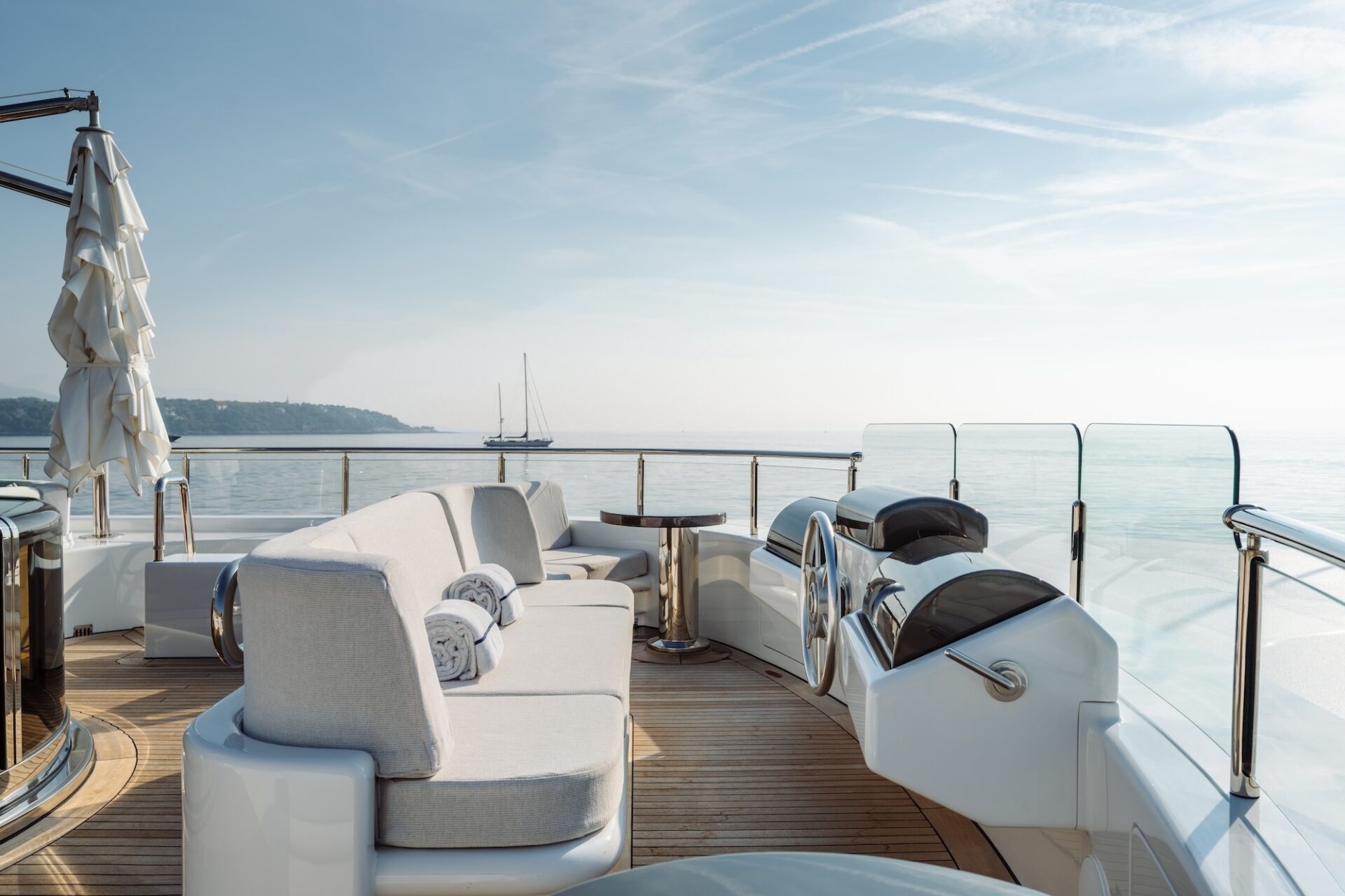 Bright, open interiors feature large expansive windows, a welcoming saloon and formal dining area for 14-16 guests, with fold-down balcony on the port side connecting seamlessly to the sea. She boasts a large swim platform, accompanying lazarette and beautiful sky lounge, which offers a relaxed retreat with games tables and ample seating, leading to an expansive aft deck for al fresco dining. Above, a vast sun deck, that surpasses any 55m in the global fleet, offers space for entertaining and panoramic views.
