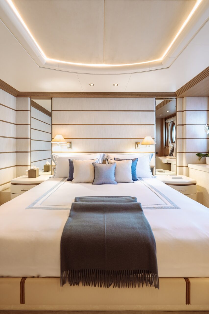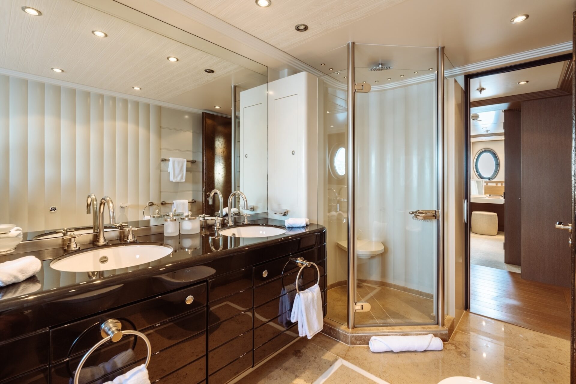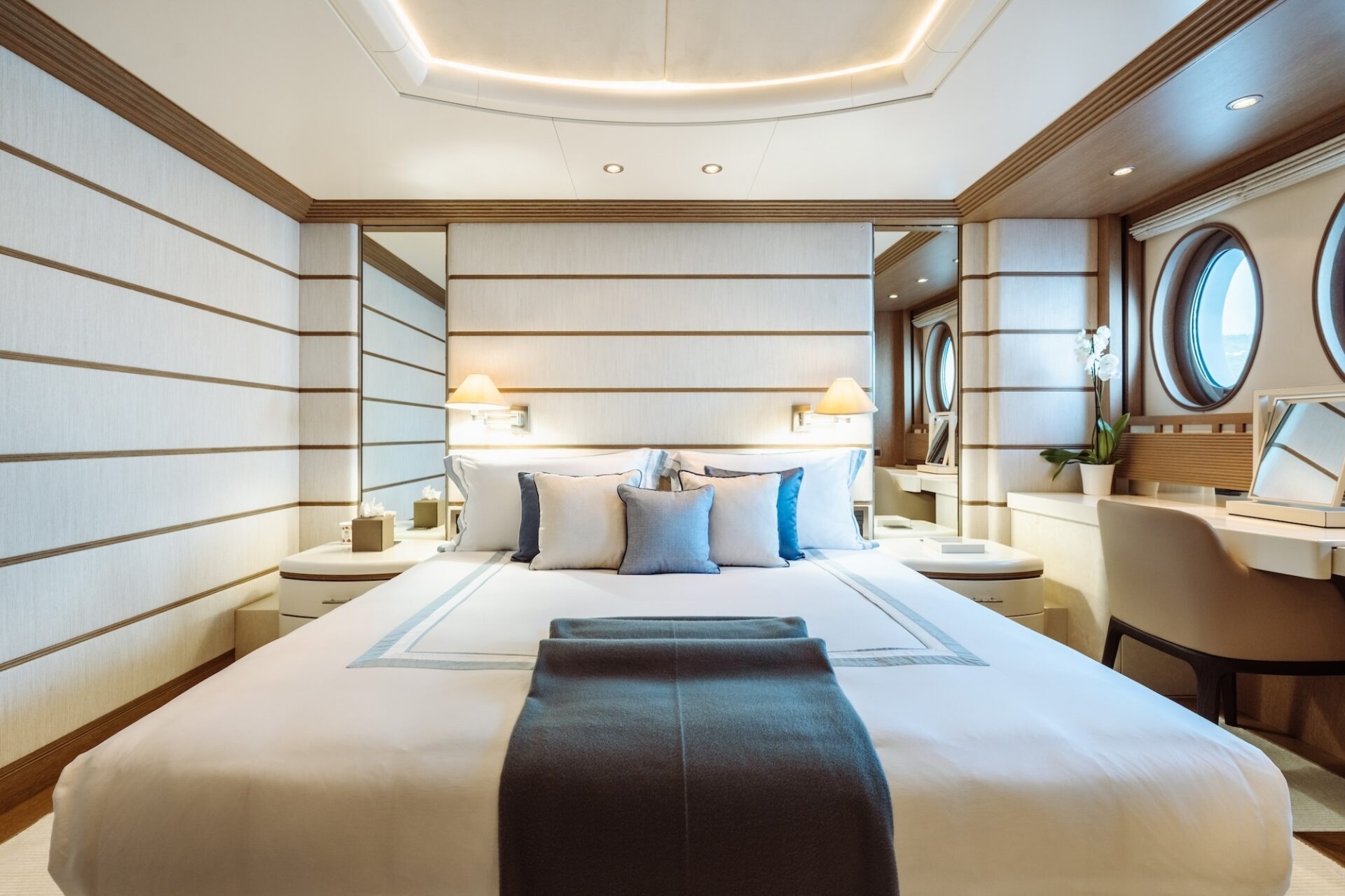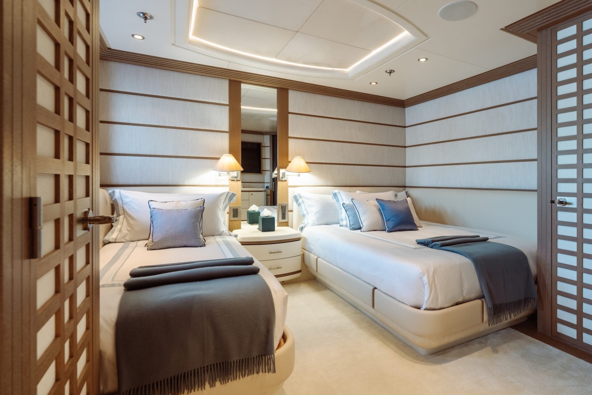Accommodation is for 12 guests in five spacious suites, including a full-beam master on the main deck, a generous VIP suite, a double cabin and two further doubles, each with an additional single berth, all offering en suite facilities. Her practical layout allows 13 crew to operate an efficient, discreet service.