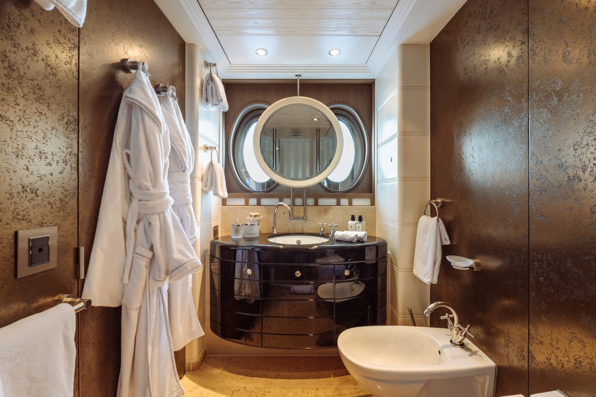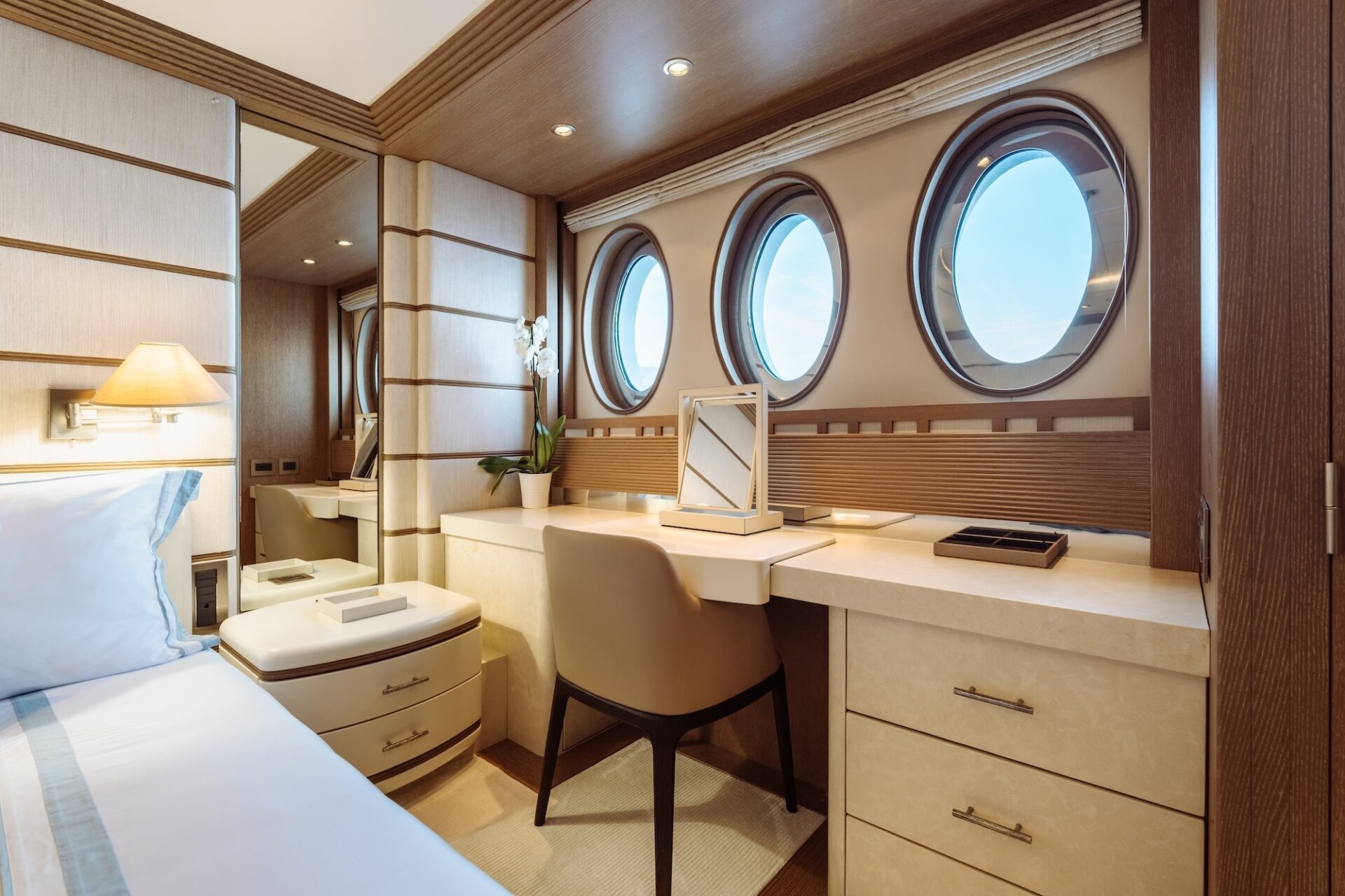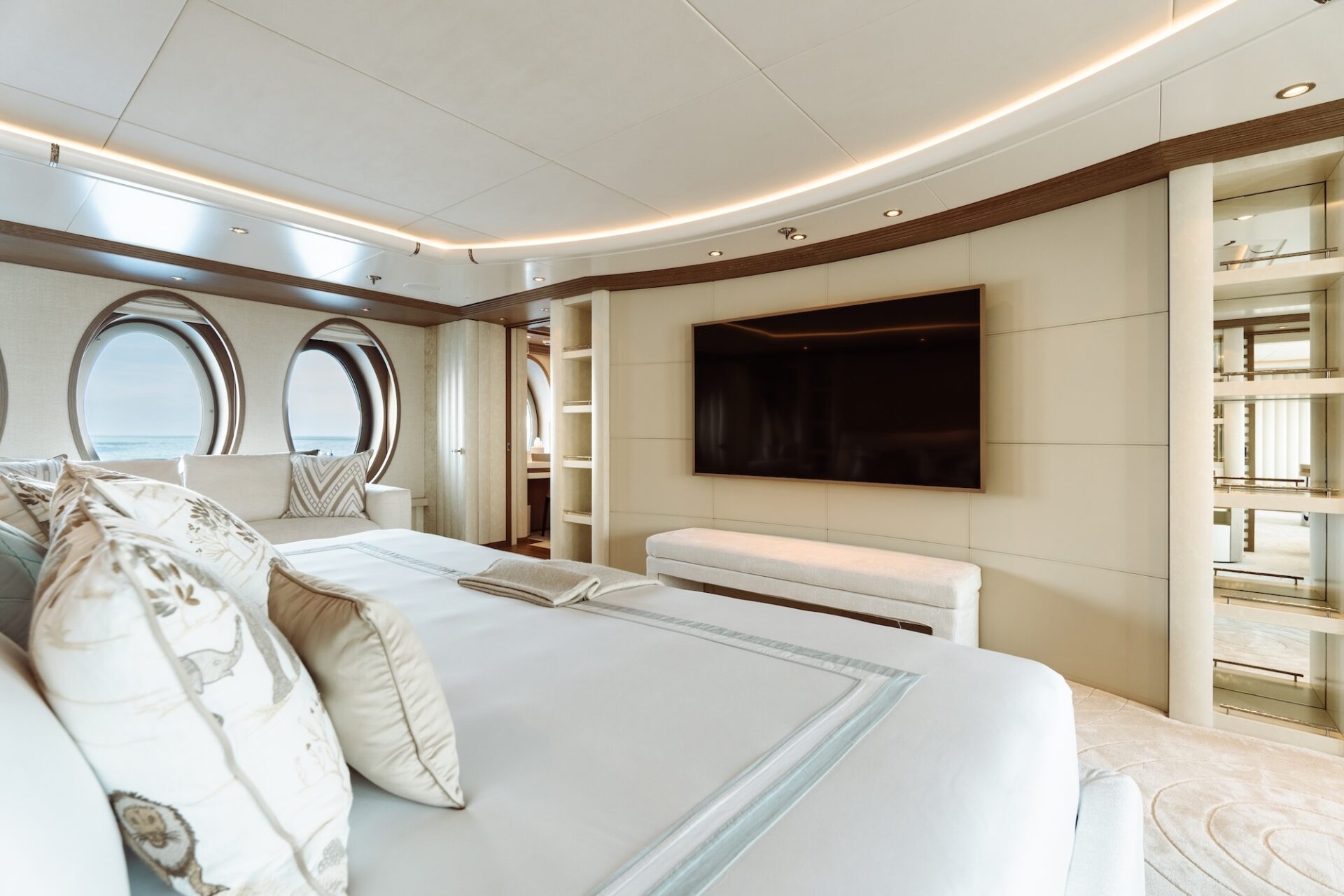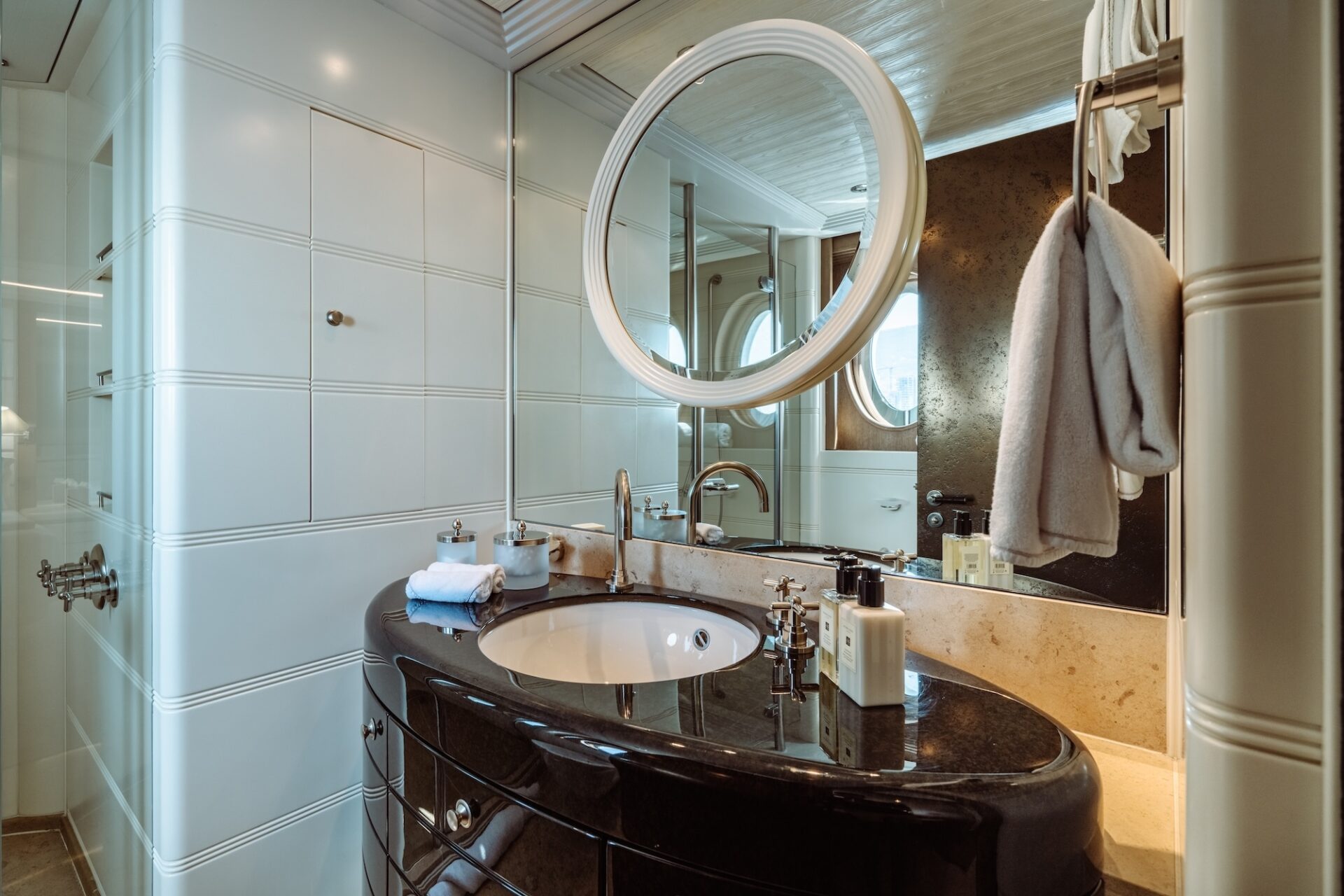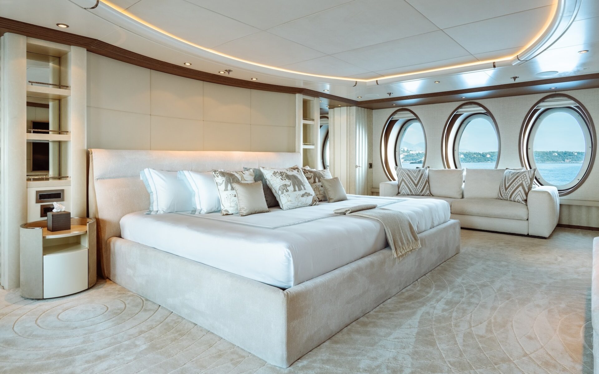 Accommodation is for 12 guests in five spacious suites, including a full-beam master on the main deck, a generous VIP suite, a double cabin and two further doubles, each with an additional single berth, all offering en suite facilities. Her practical layout allows 13 crew to operate an efficient, discreet service.