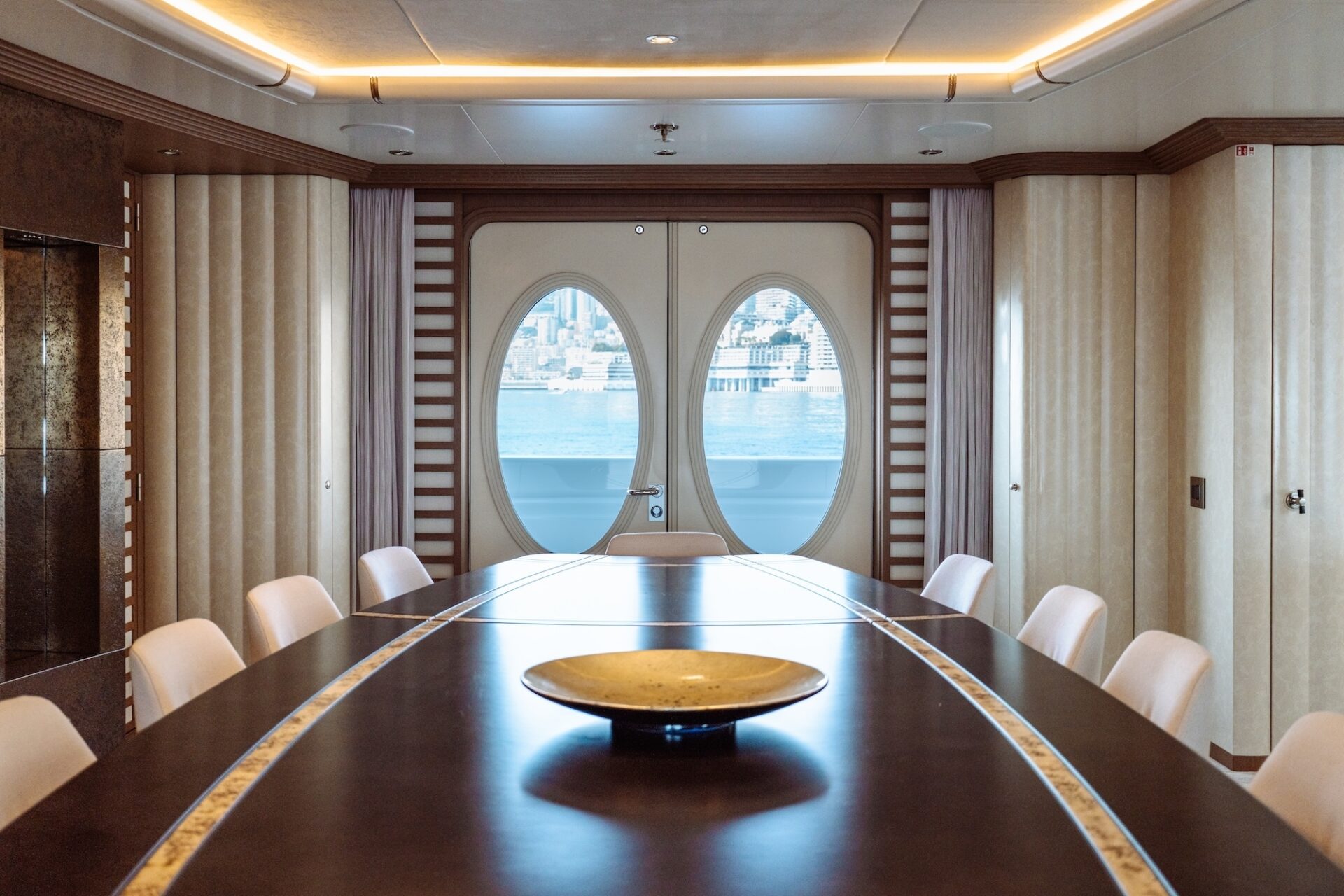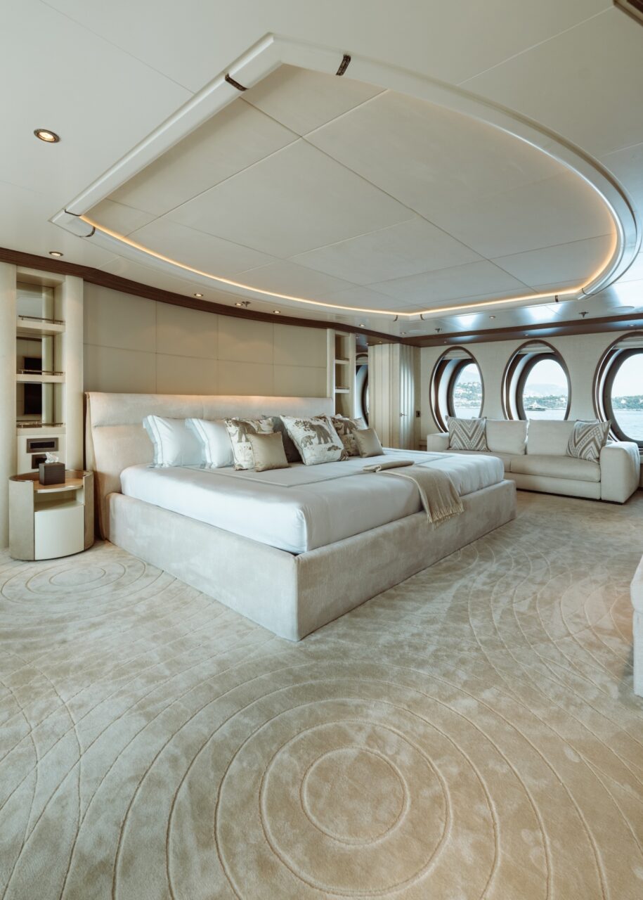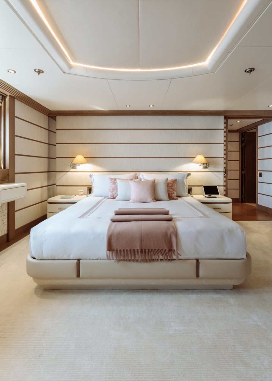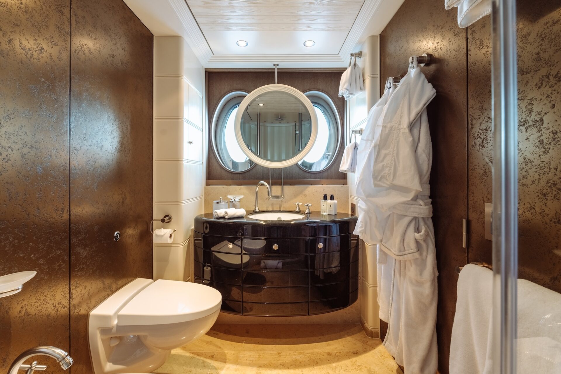 Accommodation is for 12 guests in five spacious suites, including a full-beam master on the main deck, a generous VIP suite, a double cabin and two further doubles, each with an additional single berth, all offering en suite facilities. Her practical layout allows 13 crew to operate an efficient, discreet service.