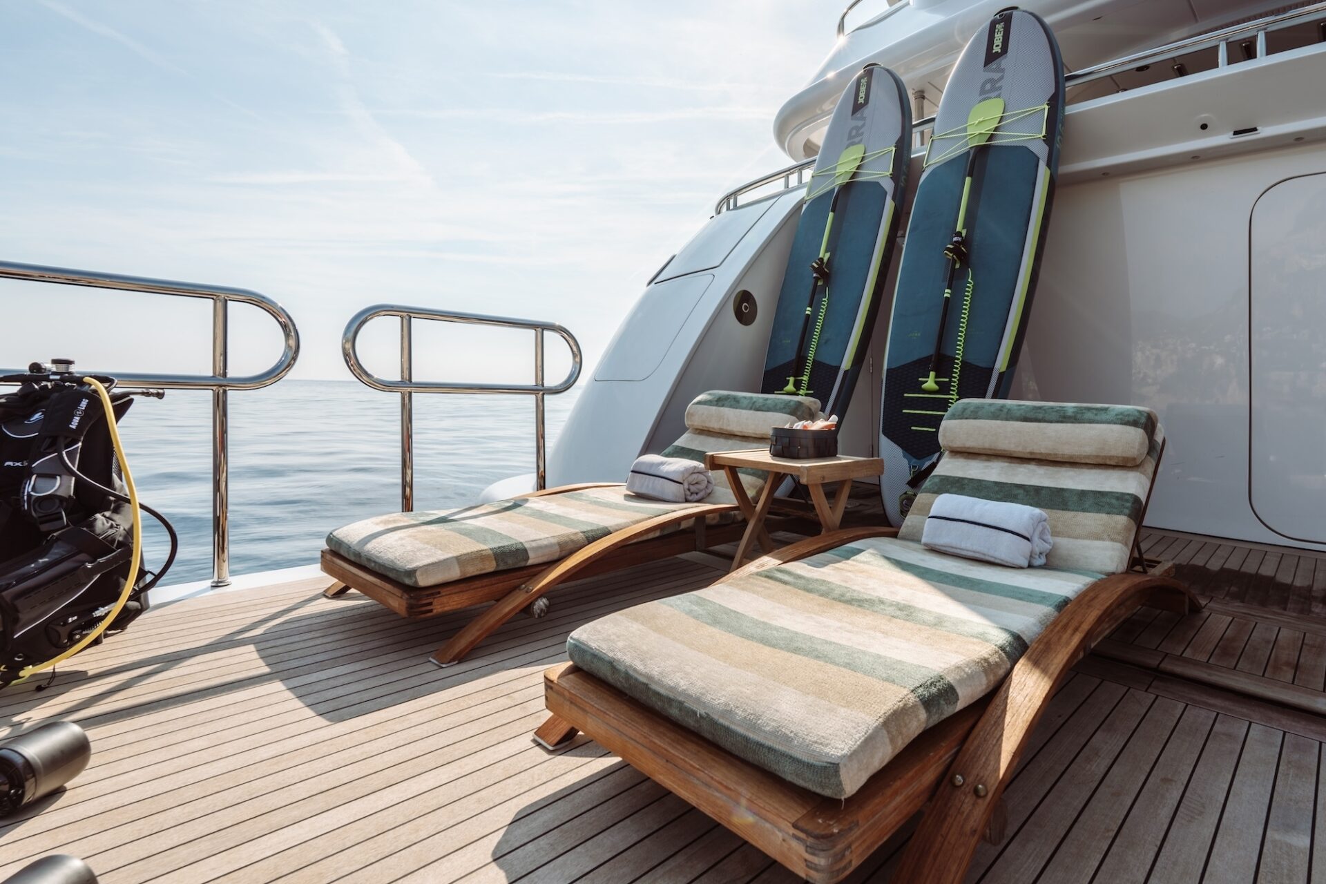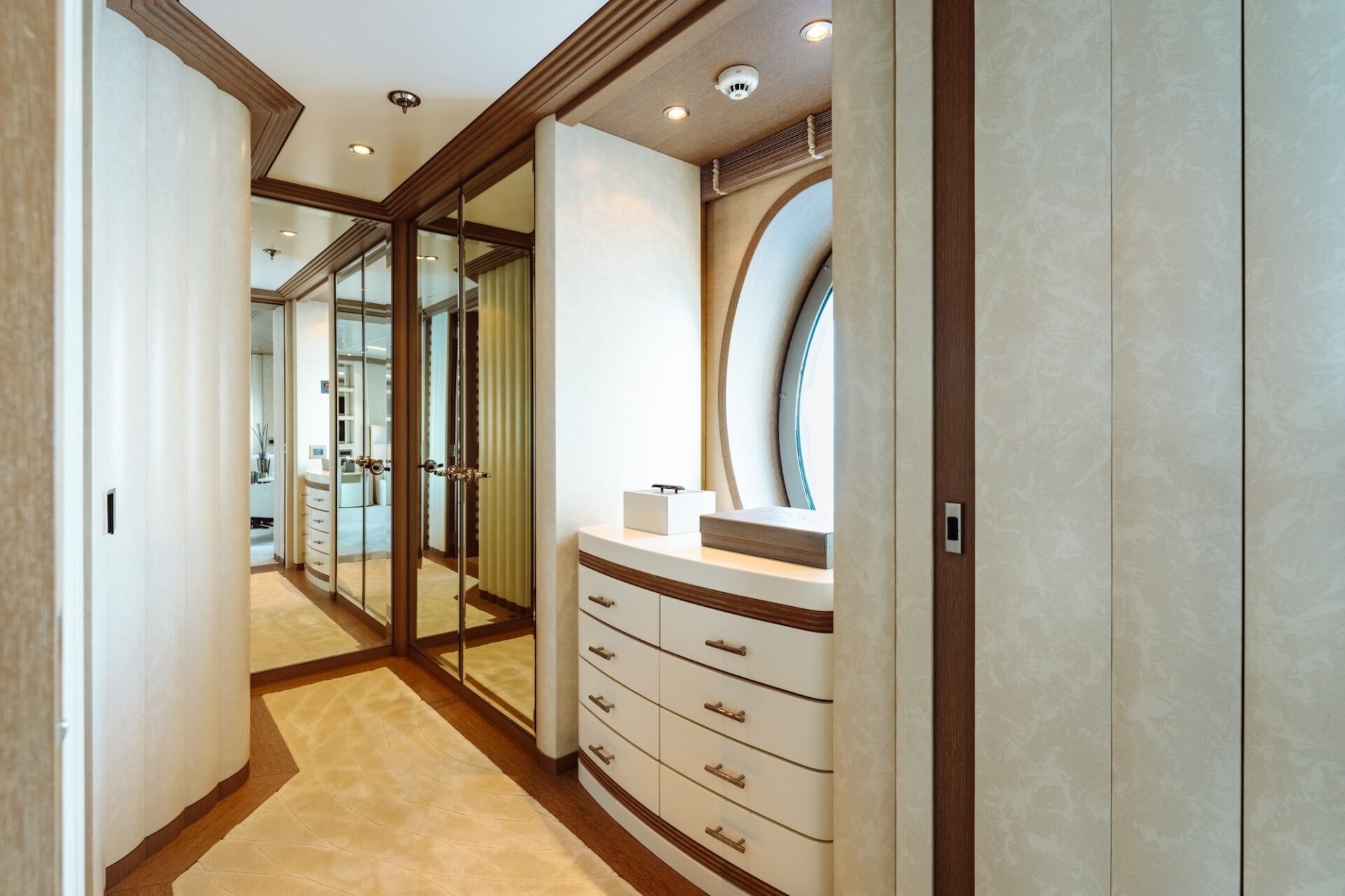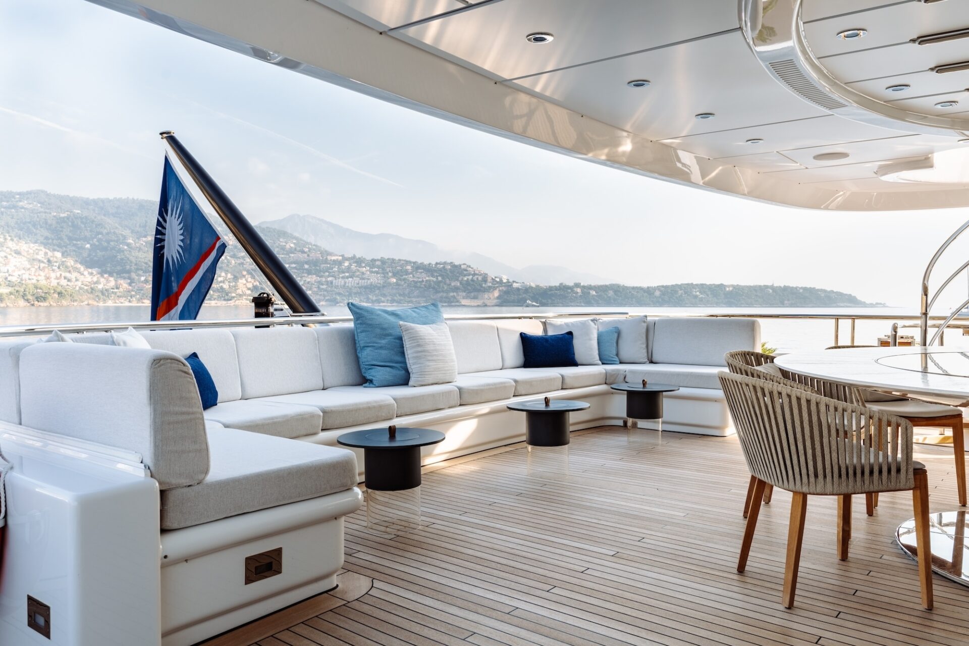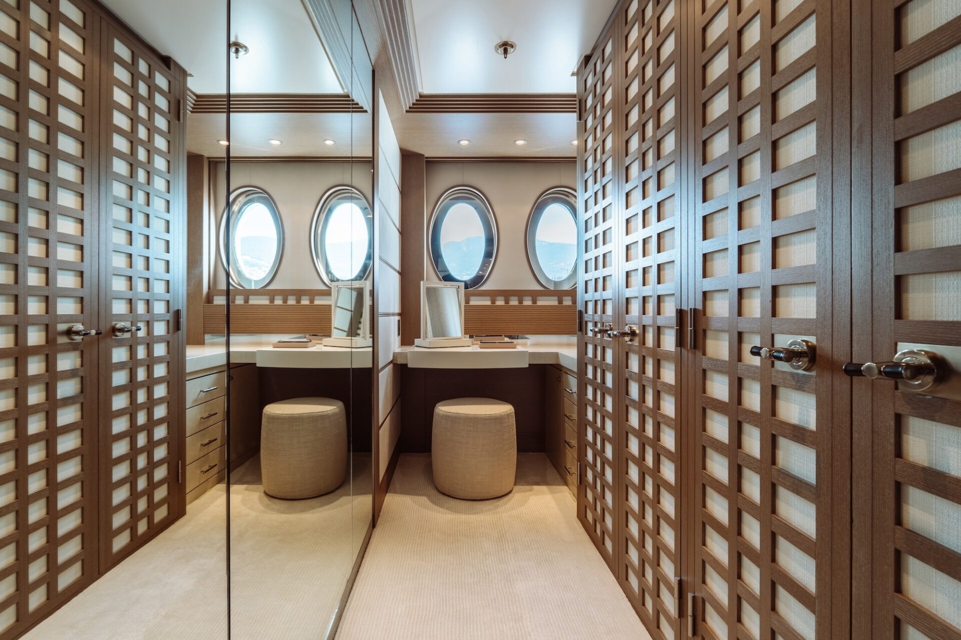 Accommodation is for 12 guests in five spacious suites, including a full-beam master on the main deck, a generous VIP suite, a double cabin and two further doubles, each with an additional single berth, all offering en suite facilities. Her practical layout allows 13 crew to operate an efficient, discreet service.